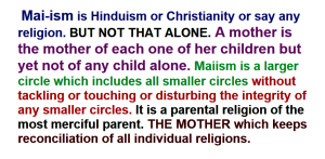 Mai-ism and Mai Swarupa say to the religionists’ world “You have surely brought the religious world to a much higher plane by emphasizing the element of “universality”. Yet one further stage is needed. A society which preaches universal outlook is surely the greatest benefactor of the world. But such institutes themselves should unite to form a Universal religion with entire intactness and respectfulness and welcomeness of all individual religions and with every facility and freedom. Such a universal religion can be preferably the parental religion of the universal motherhood or universal fatherhood or mother-fatherhood or father-mother-hood.